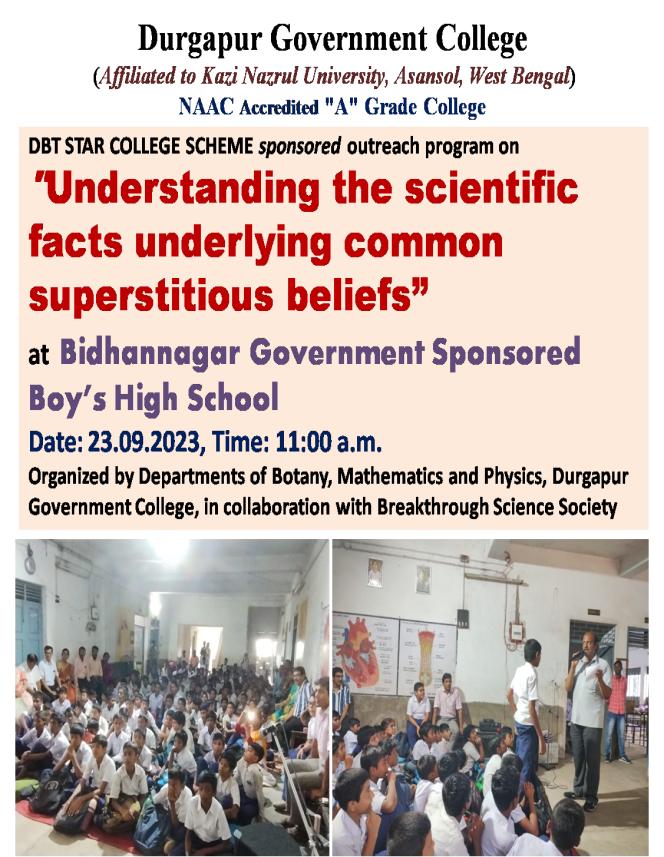 DBT STAR COLLEGE SCHEME sponsored outreach program on “Understanding the scientific facts underlying common superstitious beliefs” at Bidhannagar Government Sponsored Boys’ High School organized by Departments of Botany, Mathematics and Physics
