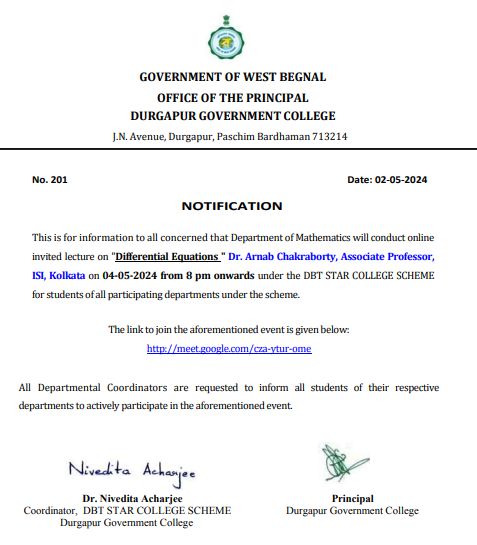 Invited Lecture organized by Department of Mathematics under DBT STAR COLLEGE SCHEME