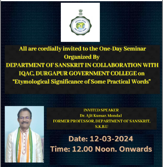 • March 12, 2024: One day seminar about “Etymological Significance of Some Practical Words” organized by Department of Sanskrit in collaboration with IQAC.