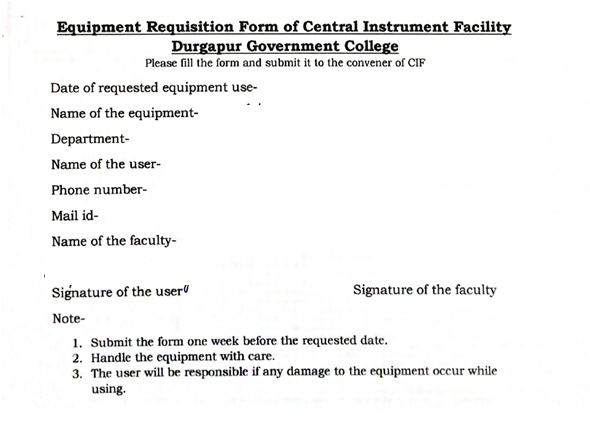 The instruments are available to all the students, research scholars and faculty members of home institution with free of cost. The users are to submit the requisition forms for using the instruments available and for sample analysis at least one week prior to book their slot.All users may contact the centre by e-mail (dgccif@gmail.com) to reserve time slot for their use and visit with the samples on the date of appointment.