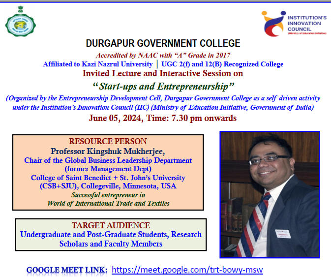 Invited Lecture and Interactive Session on “Start-ups and Entrepreneurship” organized by the Entrepreneurship Development Cell, Durgapur Government College as a self driven activity under the Institution’s Innovation Council (IIC) (Ministry of Education Initiative, Government of India