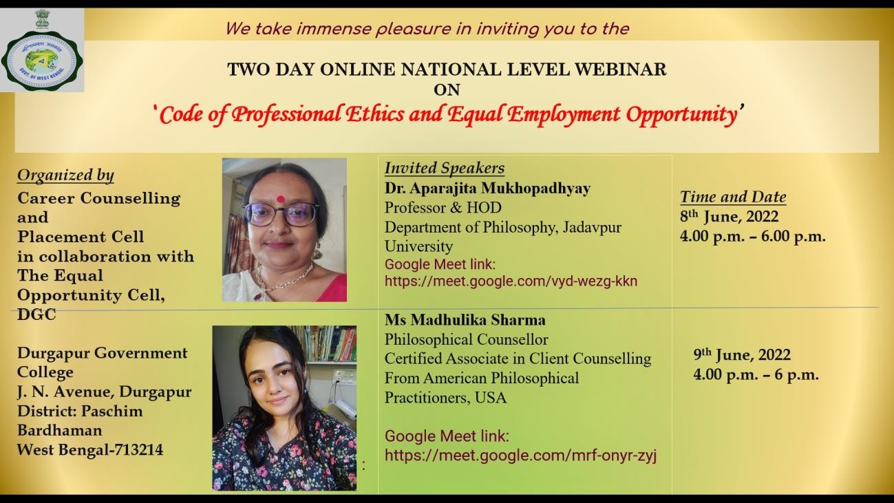 Two Day Online National Level Webinar on “Code of Professional Ethics and Equal Employment Opportunity” organized by Career Counselling and Placement Cell in collaboration with the Equal Opportunity Cell