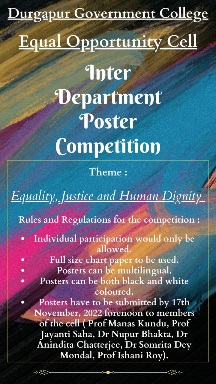 In accordance with the UGC (Promotion of Equity in Higher Educational Institutions) Regulations, 2012, published in gazette of India on 19th January 2023 and UGC Letter No. D.O. No. F.1-1/2016(Secy) dated 29-01-2016, the Equal Opportunity Cell (EOC), Durgapur Government College is constituted towards ensuring that students from diverse communal, regional and religious spectrums are able to access our pedagogical infrastructures and extra-curricular resources with dignity and self-respect. We aim at promoting diversity and inclusivity within and without the college. The EOC seeks to attain holistic wellbeing of all students and ensure that there is no discrimination in the college on grounds of disability or minority status. We intend to look after the students from SC, ST and OBC categories, persons from minority religions, and outstation students who have enrolled for higher education in our college.