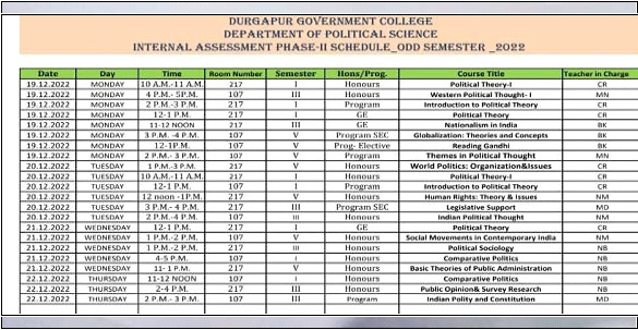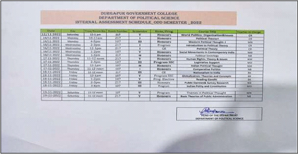 The syllabus of the affiliating university (Kazi Nazrul University, Asansol) involves provision of continuous internal assessment (CIE), included as specific weightage in the semester results of all undergraduate and post-graduate courses. Departments adopt evaluative as well as non-evaluative internal assessment strategies to assess the subject understanding, communication, presentation and problem solving skills of the students. During the entire course of each semester, an emphasis is laid on periodic monitoring of the participation of students during class activities to assess their learning levels like multiple question and answer sessions, surprise class test and interactive group discussions. Based on the feedback received, special focus is directed towards addressing the learning gaps amongst the students. Apart from formative assessment, varied summative assessment methodologies have been adopted by the Department like written internal assessment examination along with which improvement/supplementary tests are conducted for students to motivate them to perform better. Assessment in learning is often defined as process of documenting the progress of the students. In order to encourage qualitative learning and to determine the learning outcome, Departments have incorporated various tools and techniques to assess the learning levels of the student. They are broadly formative and summative as well as evaluative and non-evaluative assessment. Great emphasis is laid on continuous assessment during and after course completion. Multi stage assessment framework allows students to self-introspect their growth and learning levels and motivates them to do better in the successive assessment. Apart from academic performance, assessment also includes observing the participation and engagement of students in both classroom as well as extracurricular activities. Observational Assessment also plays a crucial role in ascertaining the learning level of each student. Important observations are made regarding several aspects of the students like their concept clarity, interaction with classmates, awareness about the surrounding environment etc. This tool enables the faculty members to understand the specific needs and learning gaps ,if any of the students concerned.