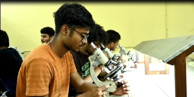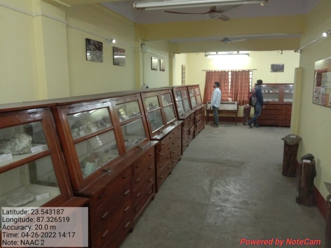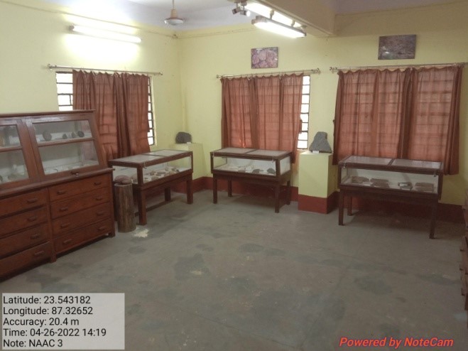 The computer laboratory of the Department is equipped with seven desktop computers, three monochrome LaserJet (A4)printer, one RGB LaserJet (A3)printer and two flatbed scanners. Two high resolution petrological microscopes (one with photomicrographic attachment and display screen), one precision balance and one mirror stereoscope with parallax bar are also housed in the same laboratory. The Micropaleontology Laboratory is equipped with five stereozoom microscopes. A rock thin section laboratory, equipped with two rock cutters, two rock grinders, one automatic thin section cutter, impregnator, petrobond and necessary peripherals provides the basic infrastructure for thin section preparation. A new laboratory is being set up for processing of rock samples for geochemical analyses. One rock crusher has already been installed.Muffle furnace, hot-air oven, water distillation plant, rho-tap sieve shaker are the other equipment for regular use of the postgraduate students. Besides these specialized laboratories, one equipped laboratory is there for the routine practical classes for microscopic studies of rocks and minerals. The geological museum dedicated in the name of Professor P.K. Mukherjee, the founder Principal and eminent Earth-scientist has been set up in the department.
