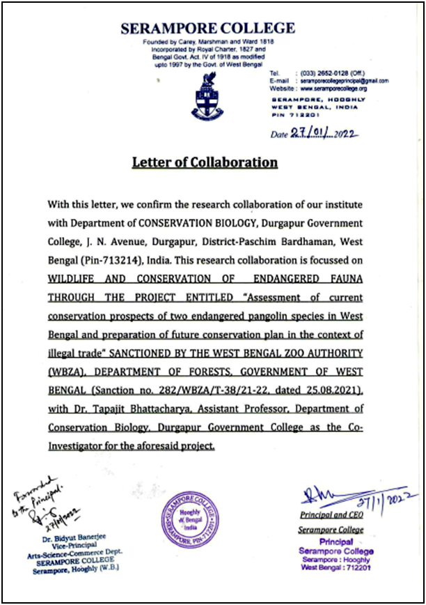 Research Collaboration with Serampore College; Joint Research Project sponsored by West Bengal Zoo Authority