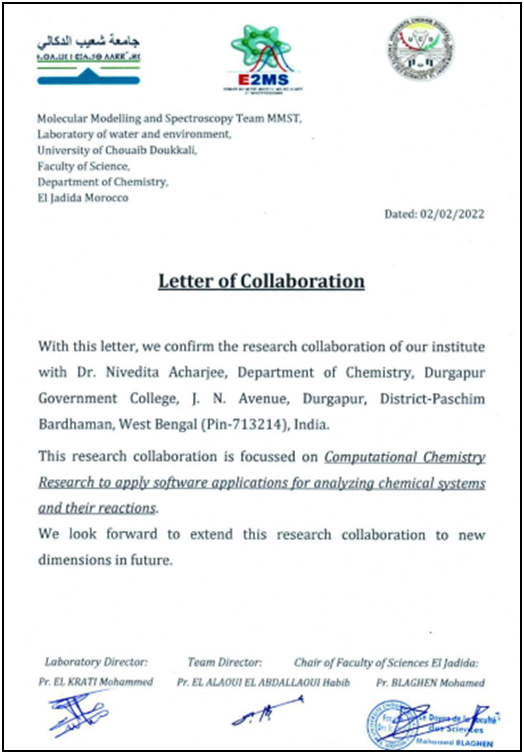 Research Collaboration with Molecular Modelling and Spectroscopy Team MMST, University Chouaib Doukkali, El Jadida, Faculty of Science, Morocco; Output : 6 International Research Articles jointly published in SCI (Web of Science)and SCOPUS indexed journals