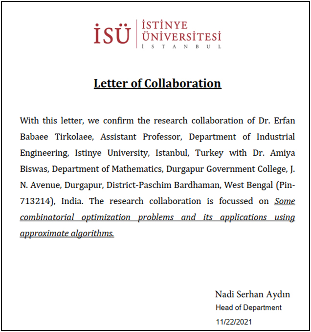 Research Collaboration with Department of Industrial Engineering, Istinye University, Istanbul, Turkey; 1 International Research Articles Under Review
