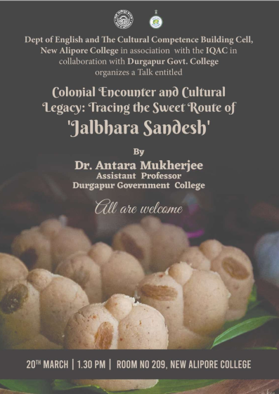 Talk on Colonial Encounter and Cultural Legacy: Tracing the Sweet Route of “Jalbhara Sandesh” organized at New Alipore College with resource person as Dr. Antara Mukherjee, Assistant Professor in English, Durgapur Government College